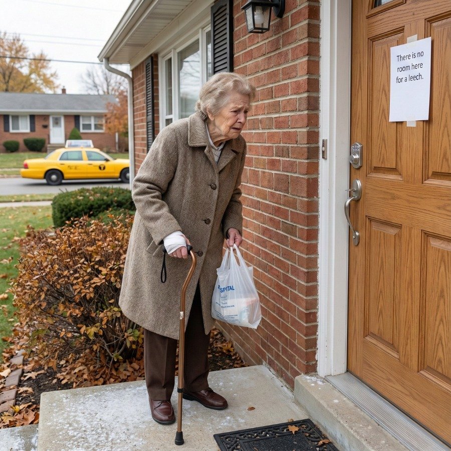 The taxi driver hesitated before pulling away from the curb. He looked in his rearview mirror at the elderly woman standing on the sidewalk, leaning