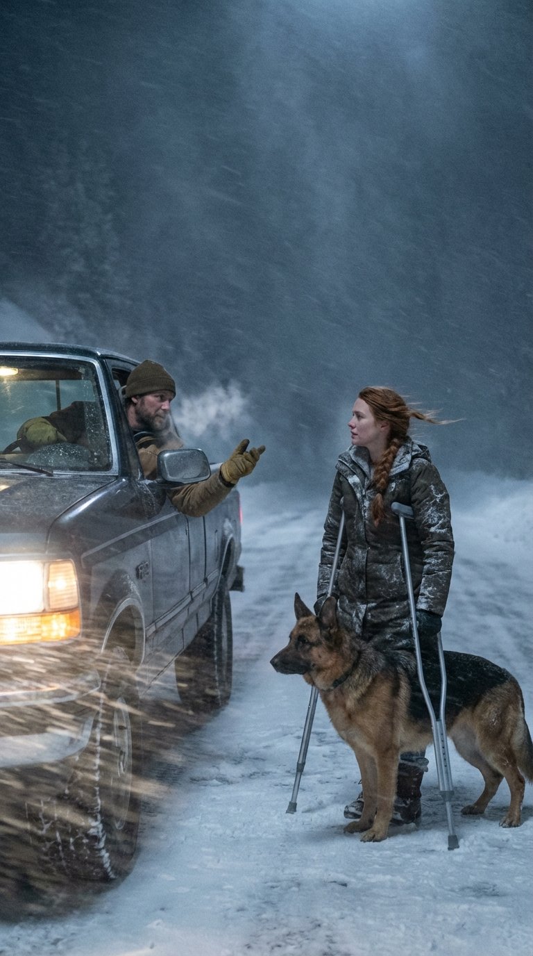 She moved along the shoulder with the slow, calculated precision of someone who had learned not to waste motion, a pair of aluminum crutches sinking into the drift with each step, her body angled against the wind as if bracing for impact, and even before Mason registered the absence of her left leg—replaced by a prosthetic hidden beneath soaked denim—he saw the German Shepherd at her side, massive and alert, pacing close enough that his flank brushed her hip, ears pinned forward, eyes scanning, every muscle communicating a readiness that was not theatrical but disciplined.
